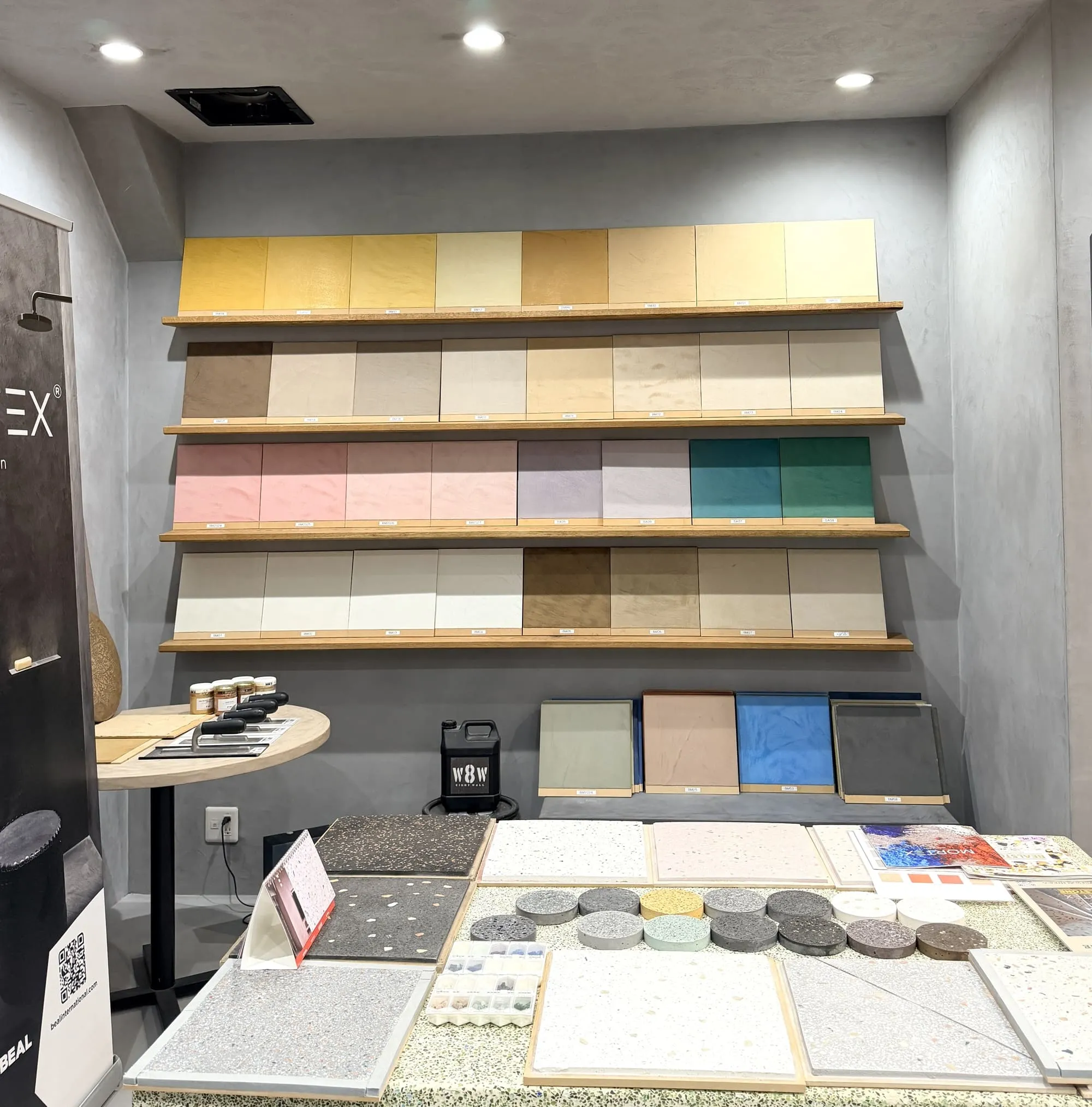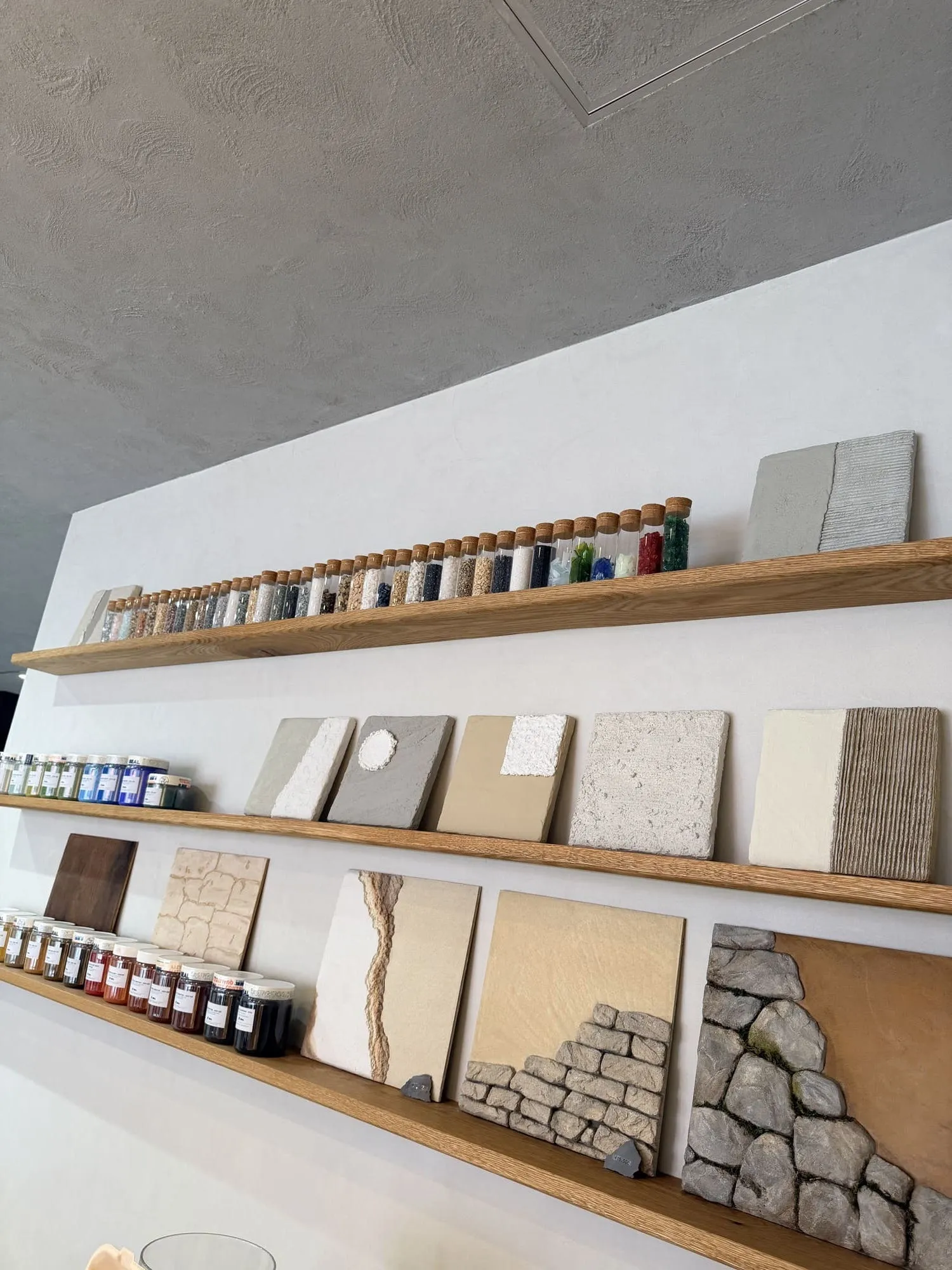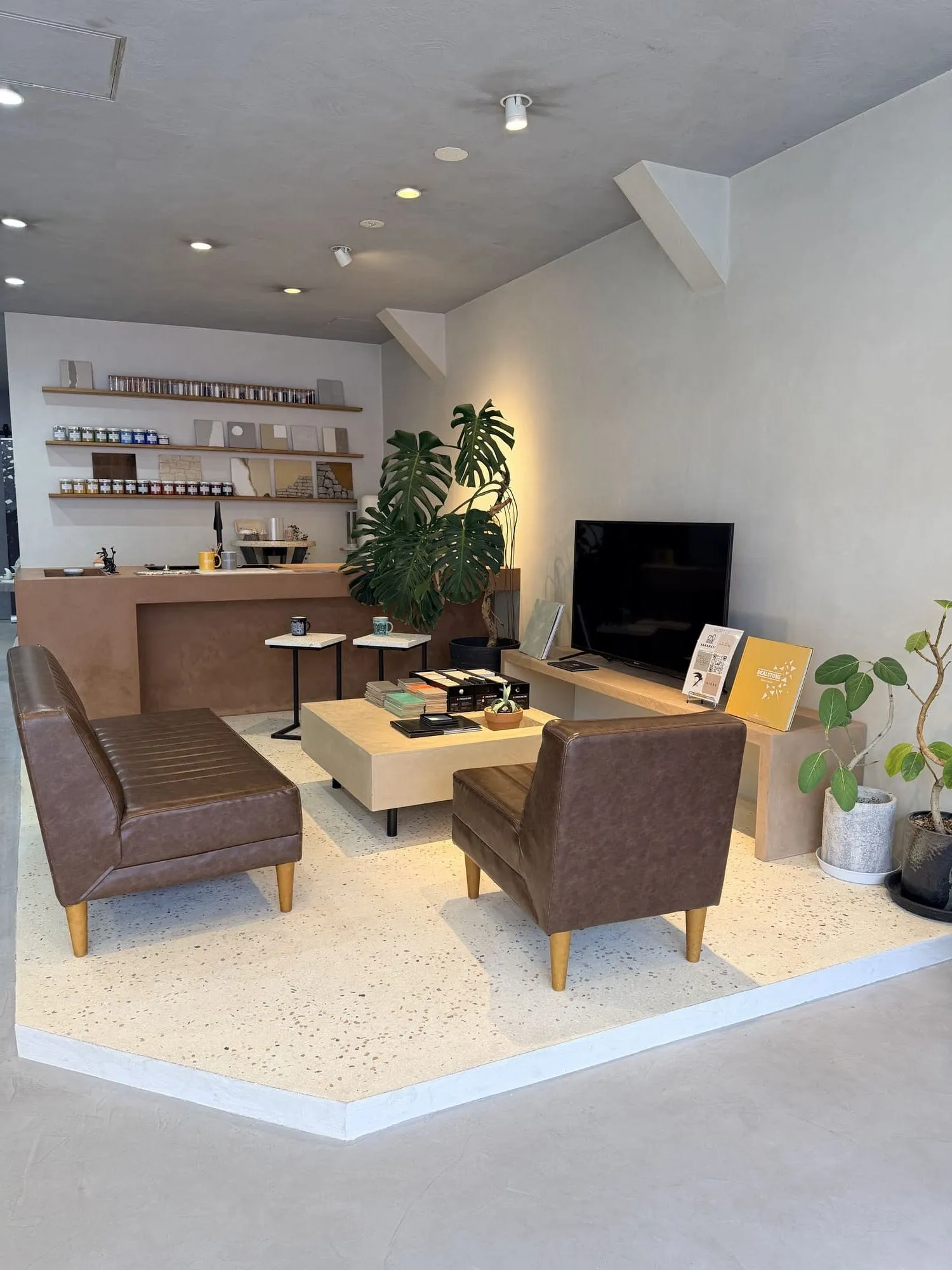 大きな面で施工された壁や床、カウンターを通じて、実際の生活空間での見え方や、手仕事ならではの揺らぎを直接ご確認いただけます。